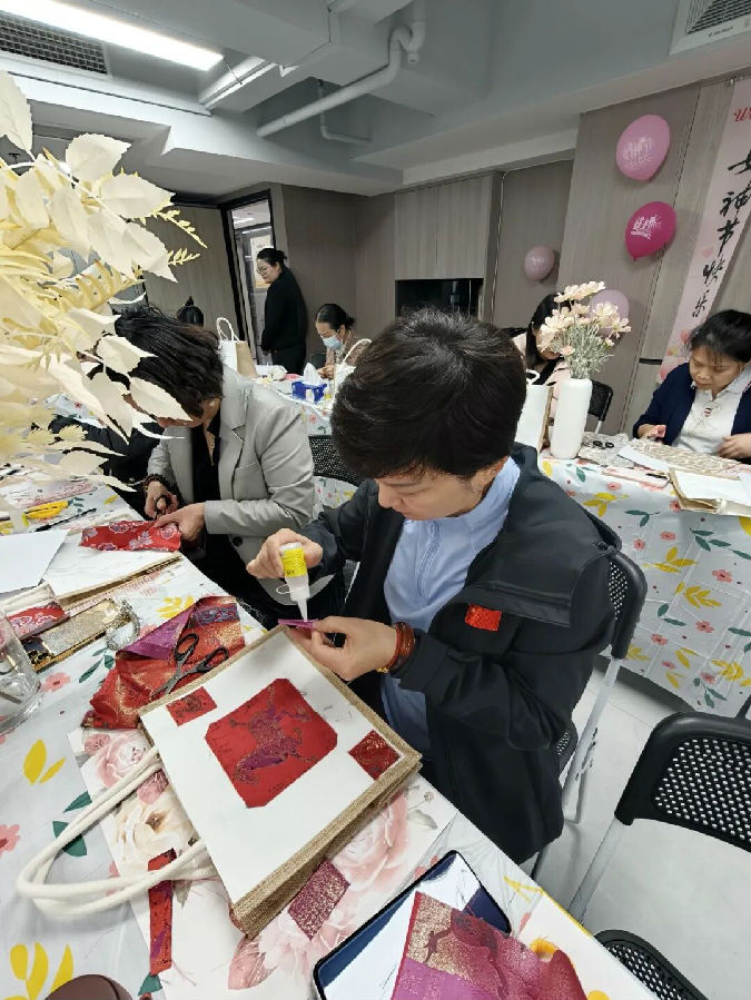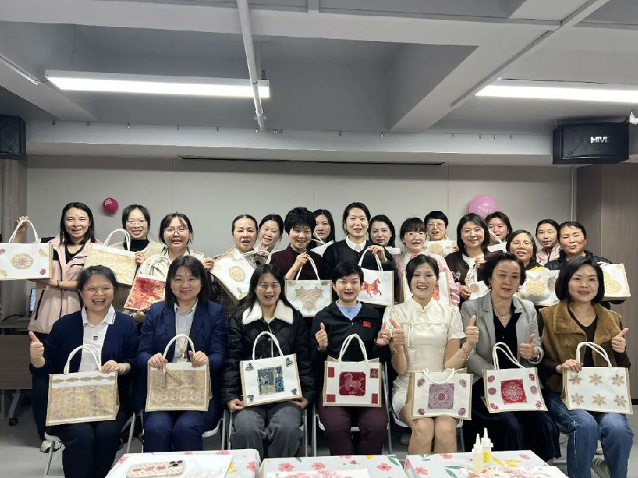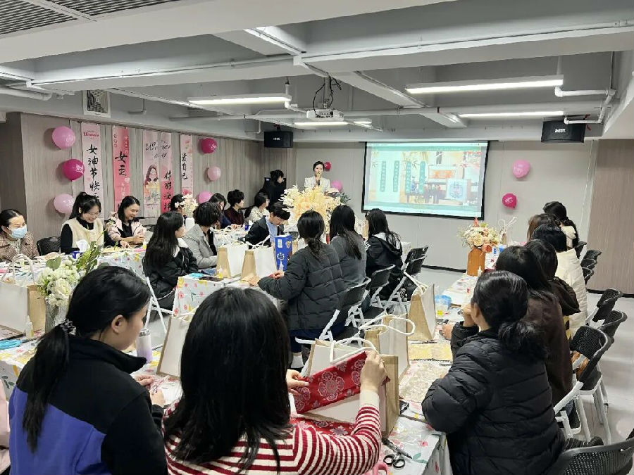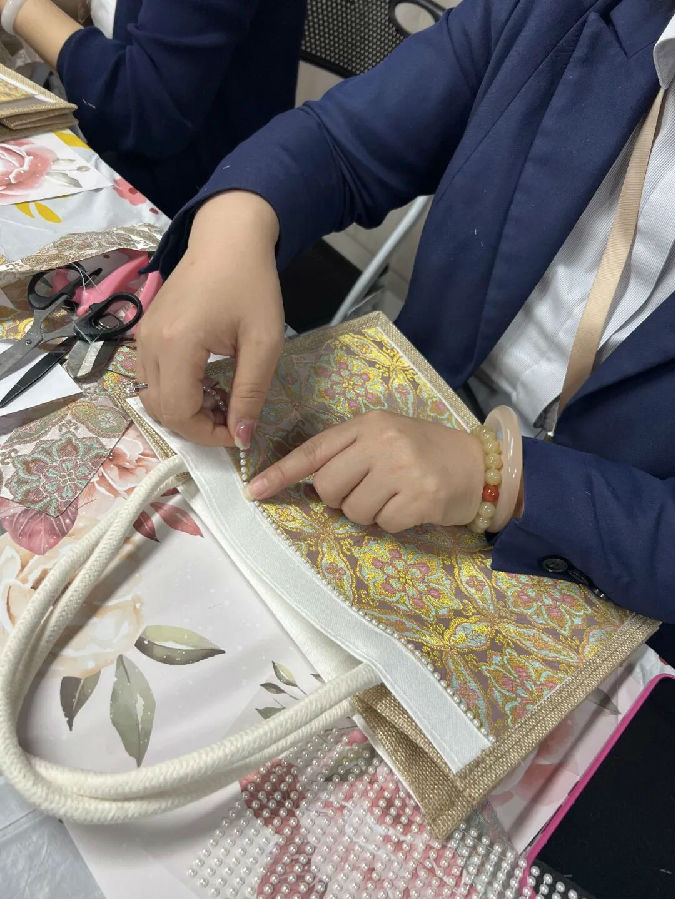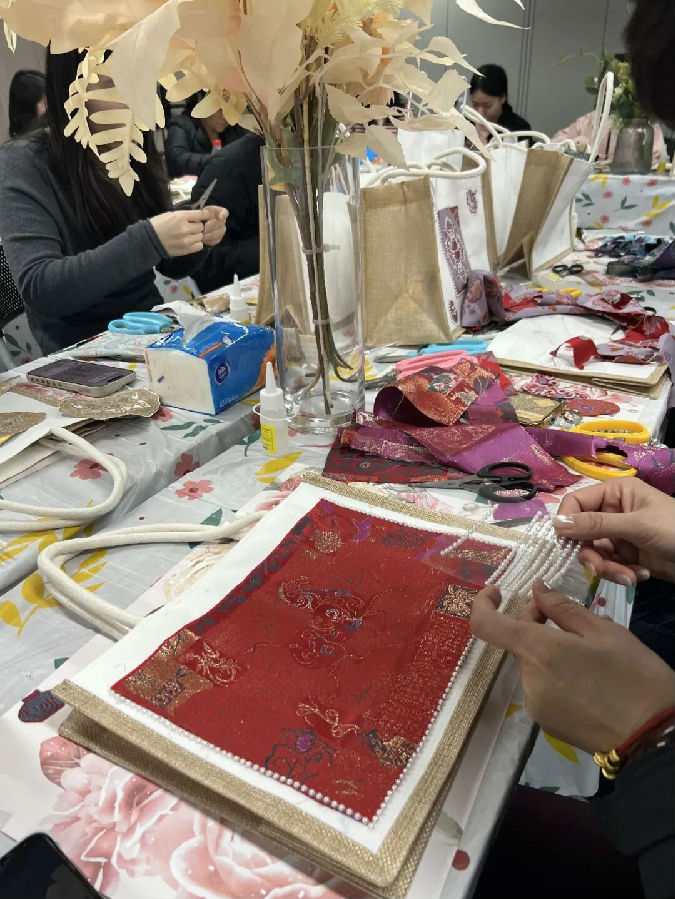 活动过程中,女职工们相互交流技巧,分享创作心得,现场洋溢着欢声笑语。经过1个小时的精心制作,20余件精美的宋锦手提袋续完成,每件作品都充满了真诚与创意。活动尾声举行了简短的作品展示和合影环节。