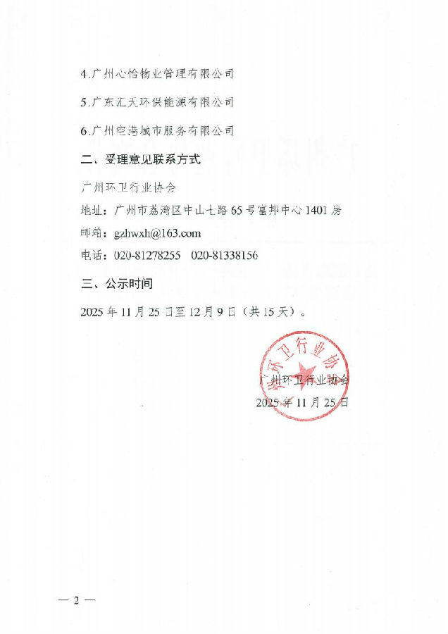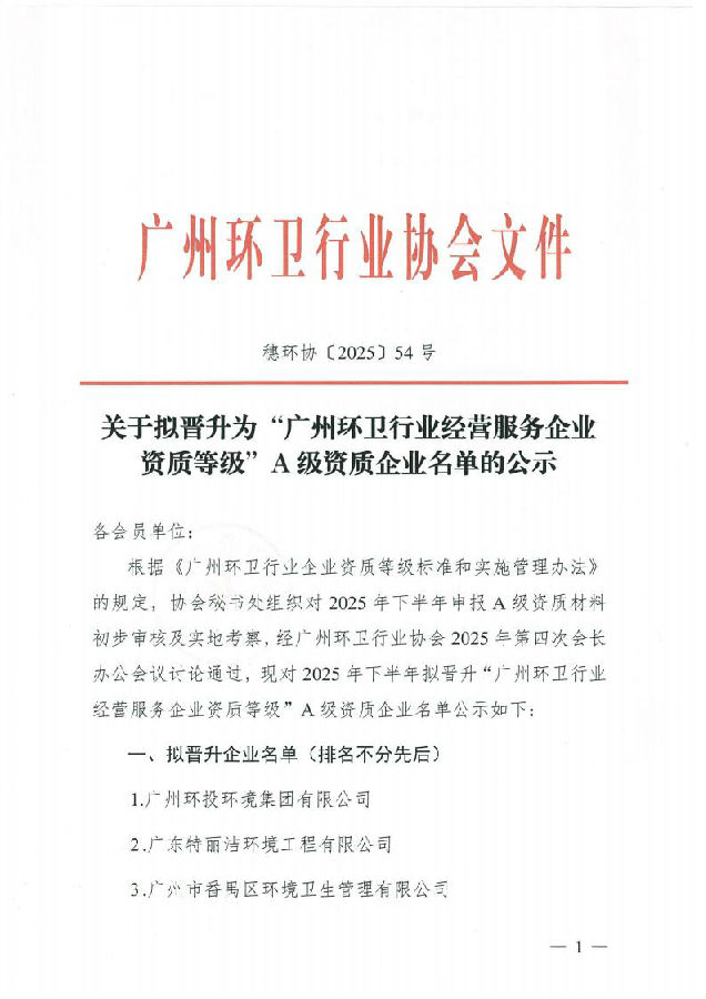 穗环协【2025】54号(关于拟晋升为“广州环卫行业经营服务企业资质等级”A级资质企业名单的公示)