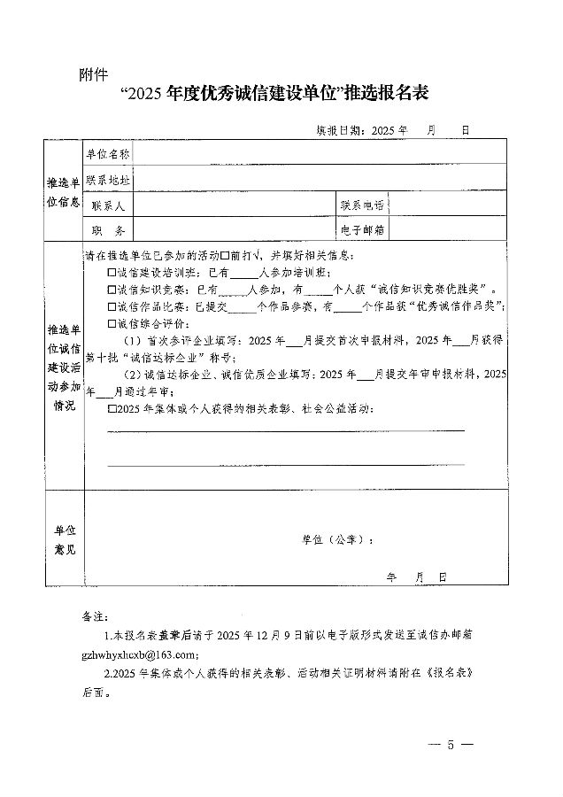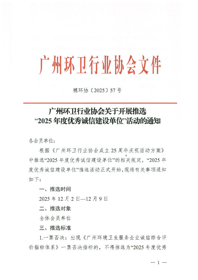 穗环协【2025】57号(广州环卫行业协会关于开展推选“2025年度优秀诚信建设单位”活动的通知)