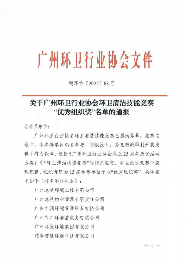 穗环协【2025】63号(关于广州环卫行业协会环卫清洁技能竞赛“优秀组织奖“名单的通报)
