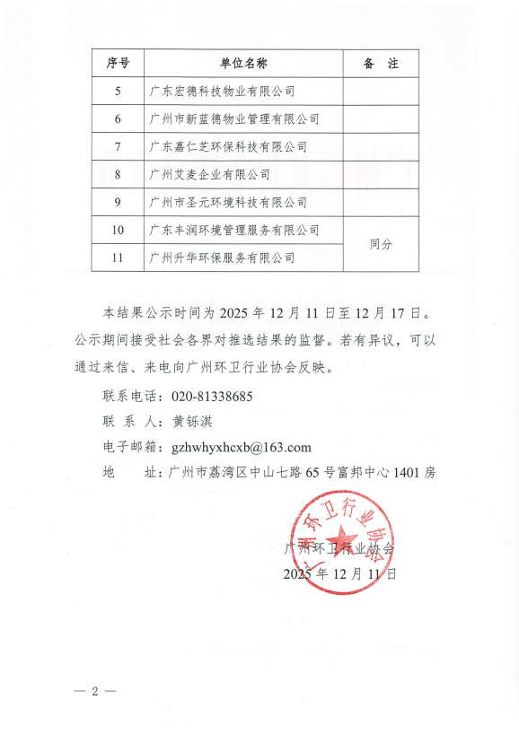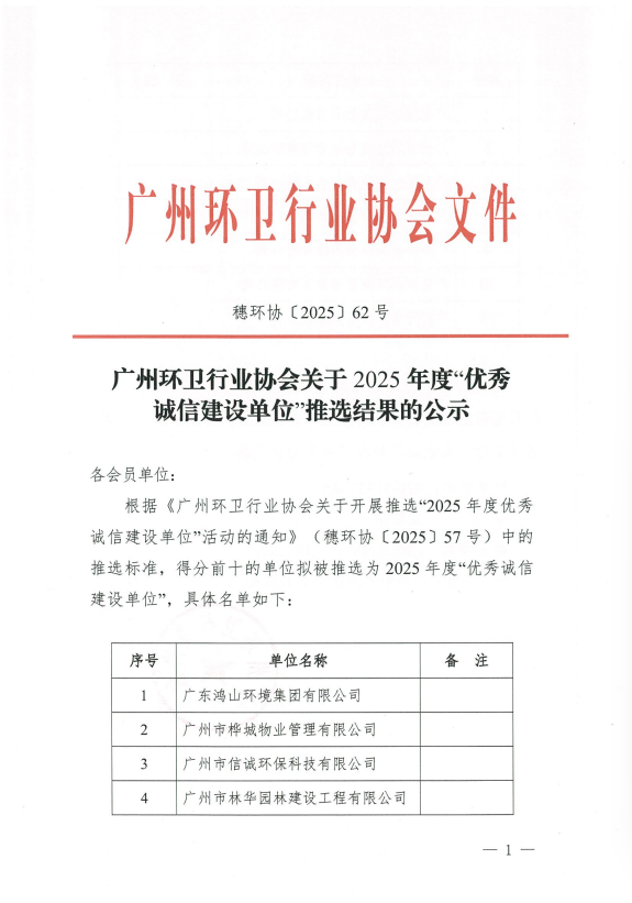 穗环协【2025】62号(广州环卫行业协会关于2025年度“优秀诚信建设单位”推选结果的公示).pdf