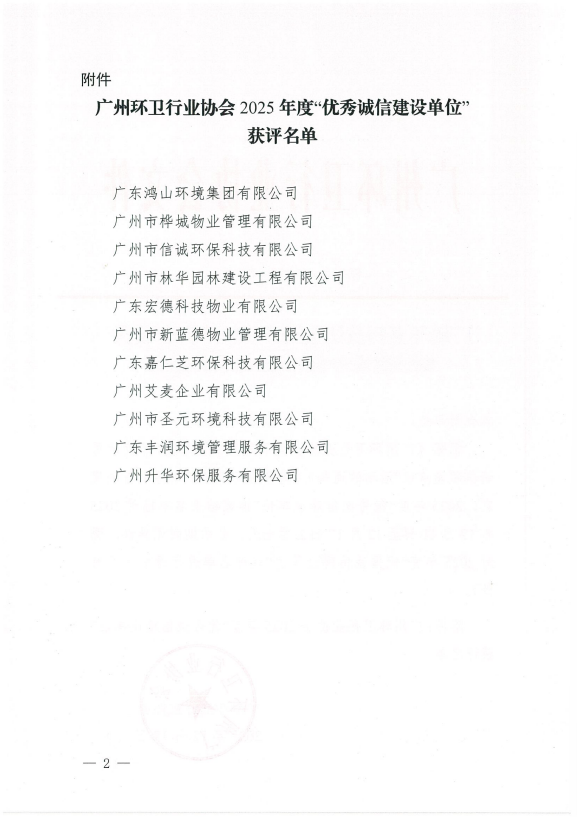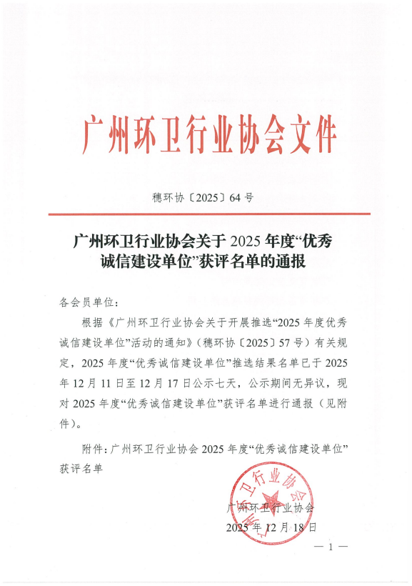 : 穗环协【2025】62号(广州环卫行业协会关于2025年度“优秀诚信建设单位”推选结果的公...