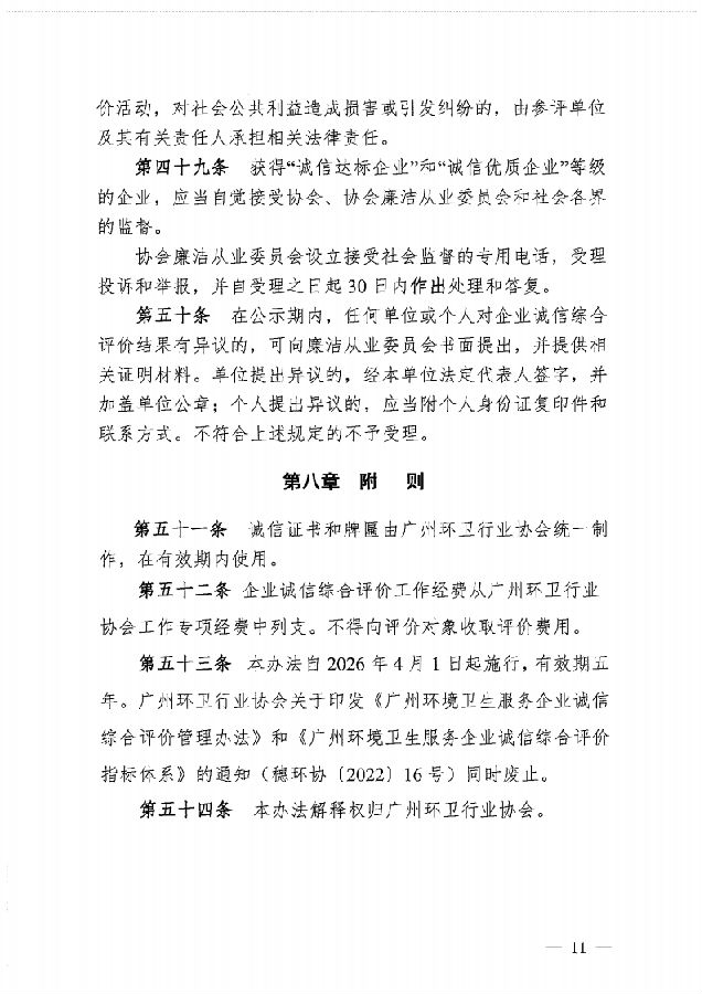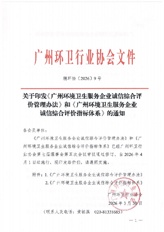 穗环协【2026】9号(关于印发新版《广州环境卫生服务企业诚信综合评价管理办法》和《广州环境卫生服务企业诚信综合评价指标体系》的通知)