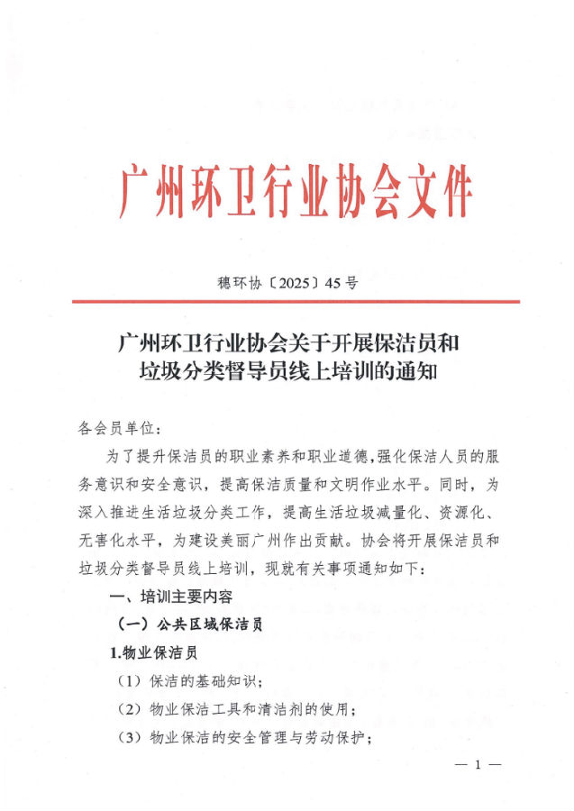 穗环协【2025】45号 (广州环卫行业协会关于开展保洁员和垃圾分类督导员线上培训的通知)