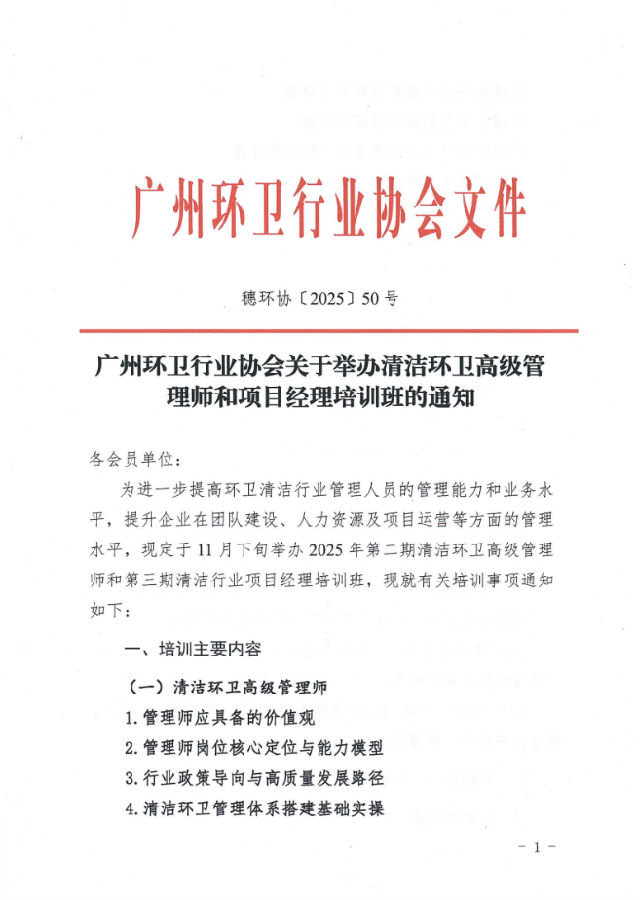 穗环协【2025】50号(广州环卫行业协会关于举办清洁环卫高级管理师和项目经理培训班的通知)